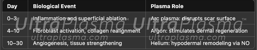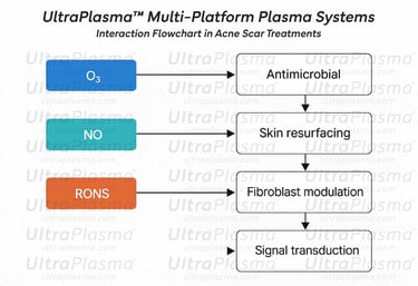 Acne scars represent a significant dermatological concern, often resulting from chronic inflammation, infection, or mechanical disruption of acne lesions. Traditional methods such as laser resurfacing, chemical peels, and microneedling offer varying degrees of success but are limited by patient tolerance, healing time, and depth control. This paper presents a comprehensive anatomical, engineering, and biochemical analysis of acne scar treatment using UltraPlasma™, a multi-platform plasma technology integrating arc, argon, and helium plasma sources. We explore the mechanisms of action, skin layer interactions (epidermis, dermis, hypodermis), and the therapeutic role of ozone (O₃), nitric oxide (NO), and reactive oxygen/nitrogen species (RONS) in tissue regeneration, collagen remodeling, and scar resolution.